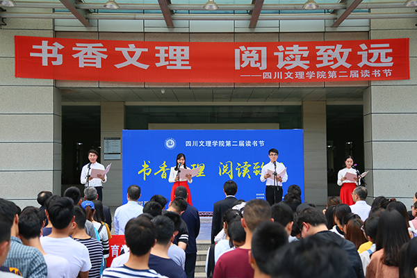 文传学院的四位同学朗诵了范藻教授为本次读书节创作的诗歌《读书让我们充满希望》,朗诵者用清晰的语言, 激昂的情感、优美的体态将观众引入原诗高远的境界,唱响了阅读的赞歌。