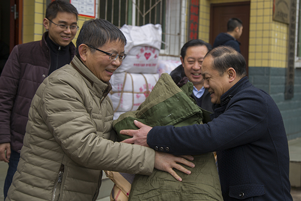 座谈会后王洪辉、侯忠明、雷超为在场的贫困群众发放了棉衣棉被。然后携带棉衣棉被和喜庆春联来到贫困户刘兴碧和晁恒忠家中,嘘寒问暖,唠起了家常,认真了解他们的生产生活状况,并将棉衣棉被送到他们的手中。贫困户刘兴碧非常感动,她说,感谢王书记代表党和政府对她的关怀,给她送来了温暖,一定要加倍努力发展生产,早日脱贫。贫困户晁恒忠听力有障碍,这次学校还为他送来了助听器。他连声说:谢谢!谢谢!非常感谢党和政府以及学校对他的关怀,他将牢记这份关爱真情,用自己的双手辛勤劳动,争取早日脱贫。