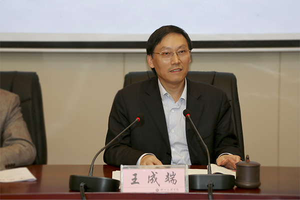 王成端校长为2016级新生代表介绍学校的办学思路、人才培养目标以及人才培养模式,并精彩的阐述了大学的“大”与“学”的丰富内涵。他指出:“对于学校的宏观建设,我们要有‘大家’、‘大师’、‘大成’,基础建设要有‘大楼’,规划目标要有‘大气’,师生德育要有‘大爱’。”“对于‘学’,同学们学的是‘学问’,基本活动是‘学术’,获得规定‘学分’完成‘学业’,靠的是好的‘学风’,生活在‘学海’,长的是‘学识’。” 他强调,要进一步加强学校相关制度的宣传宣讲,尤其是有关学生学业方面的规章制度;强调要进一步加强辅导员、班主任队伍的选拔培养;希望同学们处理好同学、老师、学业间关系,努力成为“三心四能五复合”高素质人才。