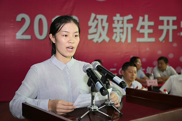 新生洪韵、陈丹柔静代表新生发言。他们分别表达了对所学专业的热爱以及努力拼搏奋斗的决心。