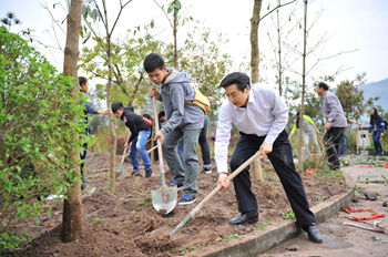 上午9时,学校党委书记李万斌、校长孟兆怀、副校长张志远、王洪辉、李壮成和数学与财经学院负责人以及20名老挝留学生来到学校凤翔山顶。在听取相关职能部门同志对本次植树活动的简单介绍后,大家四人一组分工协作,在技术人员的指导下科学有序的栽植楠木树。师生们一丝不苟地搬运、扶正树苗、铲土、填坑、夯实……一气呵成,整个场面热火朝天。经过近一个小时劳动,师生们为友谊林栽植黑壳楠32株。