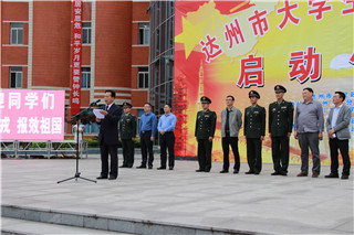 4月25日下午,由达州市人民政府、达州军分区及开元官网共同主办的2014年达州市大学生征兵工作启动仪式在开元官网莲湖校区音乐广场隆重举行。市委副书记郭亨孝,达州军分区司令员易继强,市委常委、军分区政委杨清华以及市民政局、市教育局、通川区委等相关单位领导出席启动仪式。学校党委书记李万斌出席启动仪式并讲话,仪式由副校长张志远主持。开元官网近2000名学生参加启动仪式。