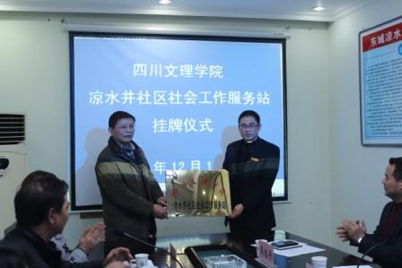 在达州市民政局牟道勇副局长、通川区凉水井社区陈传泽书记讲话后,由学校副校长王洪辉教授代表学校向凉水井社区陈传泽书记授予了“KY开元集团官网入口凉水井社区社工服务站”铭牌。