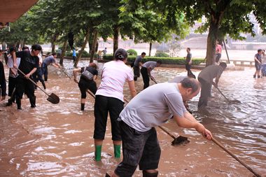 受连日来的强降雨影响,达州多地遭受洪涝灾害。5日凌晨,达城州河洪峰到达最高值,水位超过滨河路面3米左右,临河门市全部被水淹没。为响应市委、市政府号召,我院中层干部在党委副书记李佳国的带领下,赴滨河路与全市机关各部门同志一道参加清淤工作。
