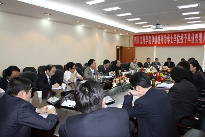 省专家组成员四川省学位办副主任张小峡,四川大学教务处长马继刚教授,成都理工大学教务处长孔繁津教授,四川师范大学教务处长杜伟教授与我院教育教学管理人员在莲湖校区D会议室进行座谈交流。专家们就办学条件、学科建设、科研、招生就业、人才引进、专业结构建设等内容进行了亲切交谈。座谈会在融洽的气氛中进行,通过交谈,专家们从不同层面深入了解了我院教育教学管理工作的基本情况。