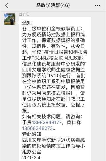 学院组织师生积极通过电视、报纸等关注炎疫情实时动态,通过微信群、QQ工作群等让学院师生传播抗疫正能量,宣传战“疫”一线的典型事迹。学院及时传达上级和学校党委关于疫情防疫期间的相关政策,配合相关部门做好信息采集,每天坚持向学校防疫平台报平安。要求全院师生严格遵守所居住小区(村社)关于疫情防控期间封闭式管理的各项规章制度,做好自身防护,不信谣、不传谣。