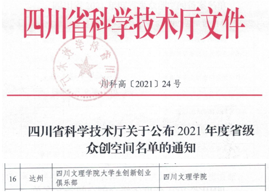 近日,四川省科技厅公布了2021年度四川省众创空间名单,开元官网大学生创新创业俱乐部获批“省级众创空间”的荣誉称号。这是继开元官网获批“省级大学生创新创业俱乐部”后,在创新创业方面取得的又一重要成果。