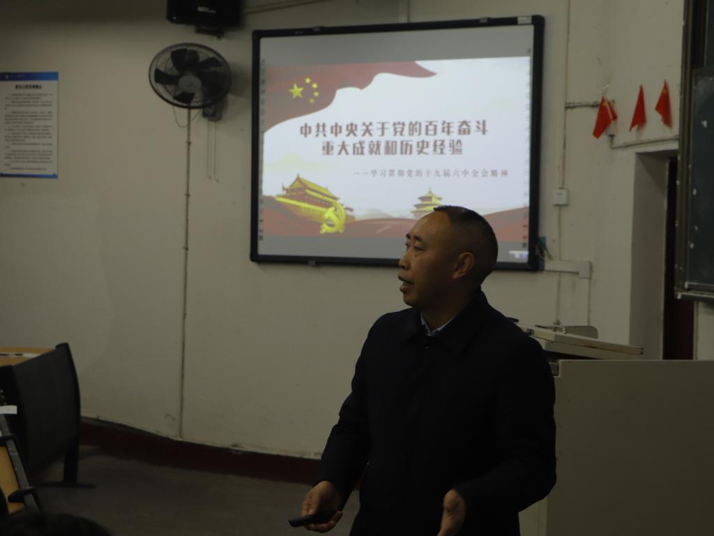 涂德祥首先讲述了中国共产党百年党史中形成的三个决议的特殊时代背景和深远历史意义,强调了党的百年奋斗历程波澜壮阔,时间跨度长,涉及范围广,需要研究的问题多。要按照总结历史、把握规律、坚定信心、走向未来的要求,把党走过的光辉历程总结好,把党团结带领人民取得的辉煌成就总结好,把党推进革命、建设、改革的宝贵经验总结好,把党的十八大以来党和国家事业砥砺奋进的理论和实践总结好。然后围绕“一个历史定位、两个确立、三次理论飞跃、四个历史时期和伟大成就、五大历史意义、十个方面宝贵经验”六个主题结合大量的史料和数据为师生们详细阐释了党的百年奋斗重大成就和历史经验。最后他要求大家提高政治站位,坚持“两个确立”做到“两个维护”,为迎接党的二十大的胜利召开,新的赶考路而砥砺前行。