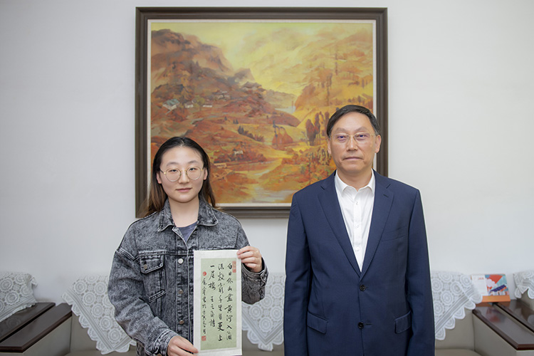 4月11日,党委书记王成端把一幅手书作品《登鹳雀楼》转交给文学与传播学院2019级汉语言文学专业学生陈忆雯。这幅作品是77级校友田雁宁寄来送给陈忆雯的,鼓励她踏实学习,不断精进,打好辉煌人生的坚实基础。