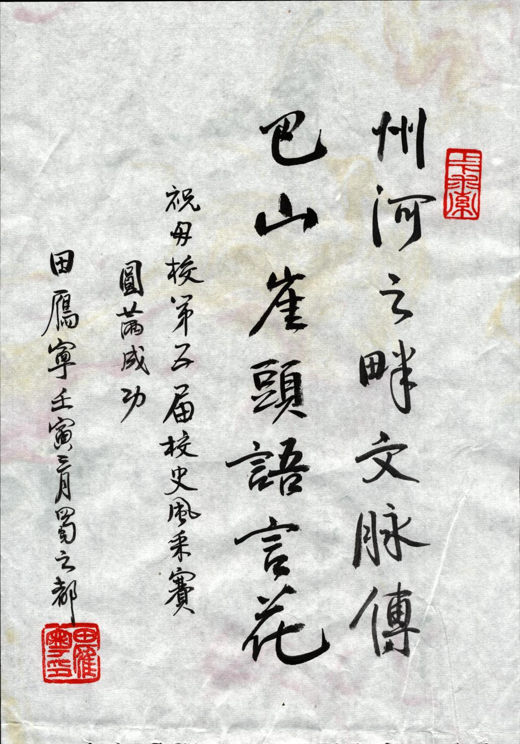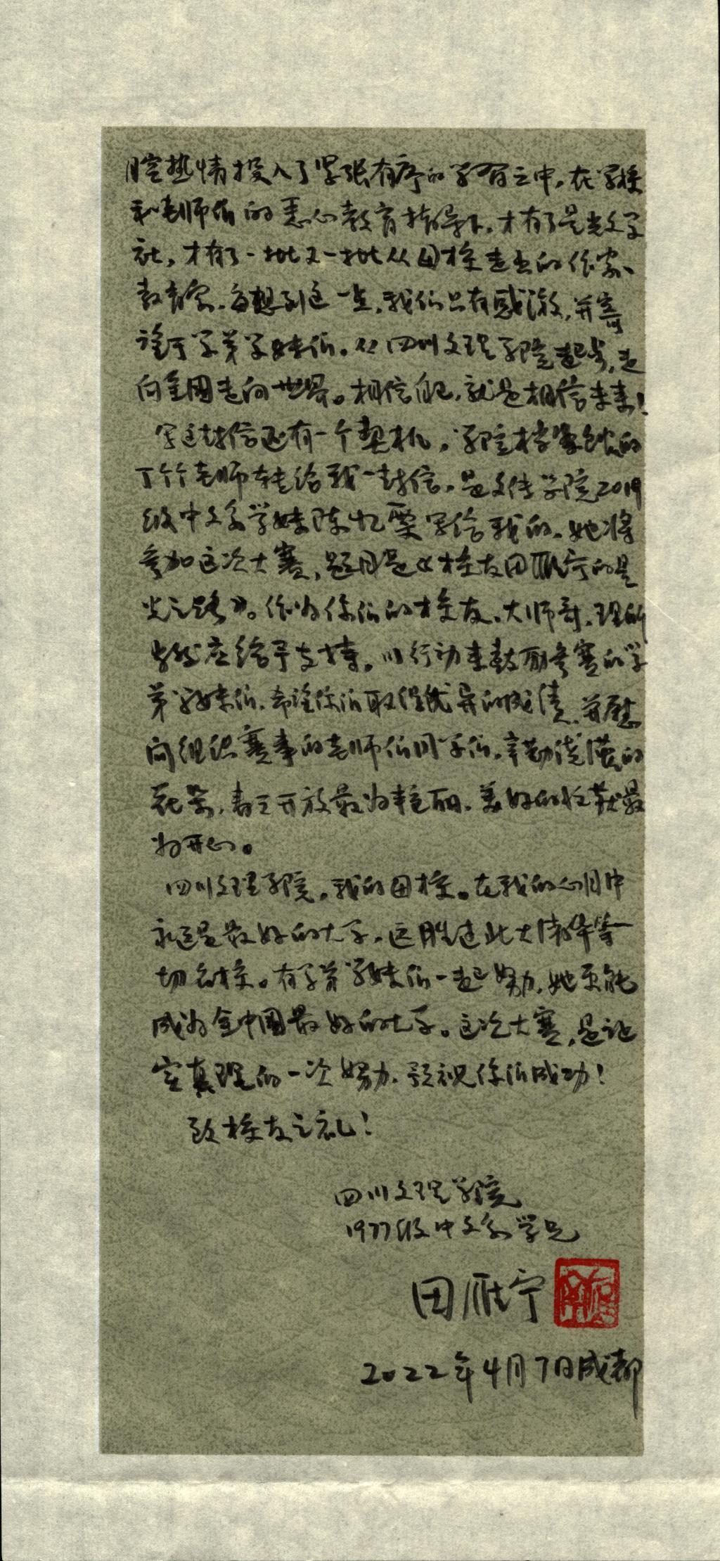 出于对母校和对学弟学妹的关心,田雁宁为即将举办的第五届中英文校史解说风采赛和讲述文理故事的校史解说员来信祝贺并勉励。田雁宁还专门题词“州河之畔文脉传,巴山崖头语言花”,“祝母校第五届校史解说风采赛圆满成功”。
