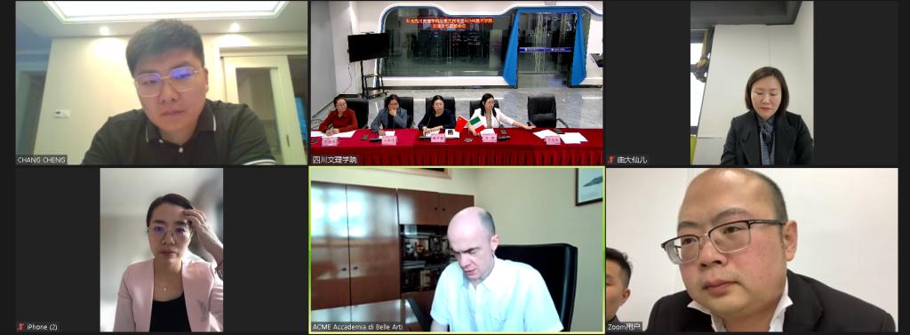 5月18日下午,学校与意大利米兰ACME美术学院召开了合作交流视频会议。米兰ACME美术学院院长Pietro Previde Prato及院长助理Jacopo Melzi、中方代表郭承,开元官网副校长程碧英、美术学院院长刘承川、国际交流合作处处长李锣参加会议。