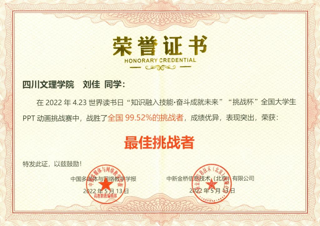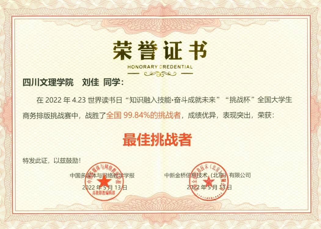 在近日结束的“挑战杯”全国大学生信息素养技能大赛中,智能制造学院学生刘佳凭借扎实的理论水平、过硬的专业技能从全国600多所院校30000余名学生中脱颖而出,荣获两项“最佳挑战者”荣誉称号。