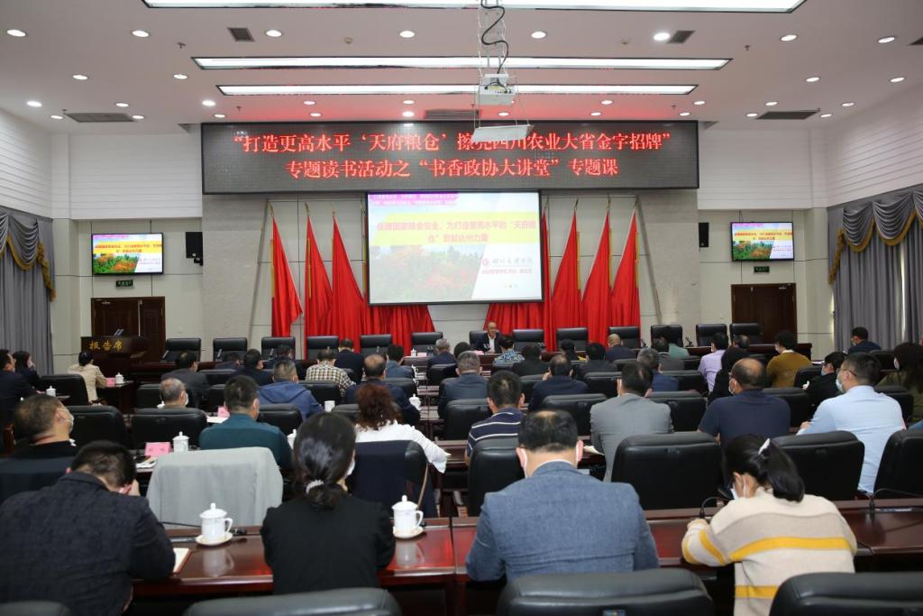 为深入学习领会习近平总书记在党的二十大报告中提出的“确保中国人的饭碗牢牢端在自己手中”的重要指示,迅速掀起学习宣传党的二十大精神热潮,进一步提高政协委员履职工作质效,10月17日达州市政协举办“打造更高水平‘天府粮仓’擦亮四川农业大省金字招牌”专题读书活动之“书香政协大讲堂”专题讲座。财经管理学院院长傅忠贤教授应邀作“保障国家粮食安全,为打造更高水平的‘天府粮仓’贡献达州力量”专题讲座。
