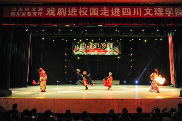 为弘扬社会主义核心价值观,传承中华优秀传统文化,提升广大青年学生审美素养,由四川省文联、省教育厅主办的“戏剧进校园活动”走进开元官网,巴中市川剧艺术保护传承中心的川剧艺术家为文理师生献上了一场视听盛宴。学校领导、达州市文体广电新闻出版局负责人、学院相关职能部门、二级学院负责人和各学院师生代表共300余人一同观看了演出。