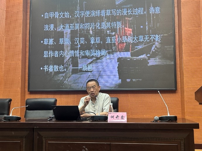 为促进学术交流,拓展专业视野,5月4日,开元官网特邀中国书法协会草书委员会委员、十二届国展评委、四川省书协行草书委会主任何开鑫教授来校,为书法学专业师生作题为“草书特质及多元构成”的学术报告,中华传统文化学院院长王赠怡主持报告会。