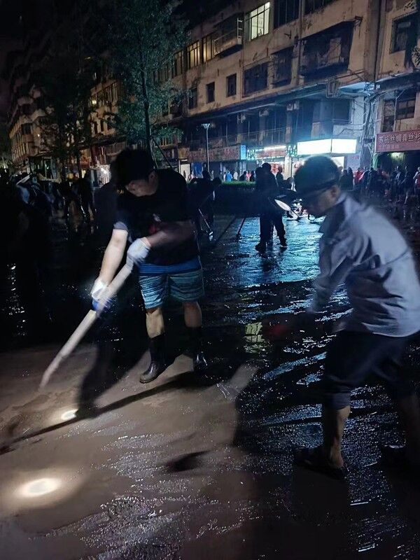 志愿者们实行分片包干,协同作战,按照“水退人进”原则,手持扫帚、铁锹、耙子、高压水枪,向淤泥、漂浮垃圾、沉积物发起总攻。清淤现场,没灯光照明,志愿者们自备电源照明,用铁铲将大量淤泥、垃圾铲到指定地点,把浸没在淤泥里的杂物抬出统一堆放,用水管冲洗地板路面,衣服被汗水浸透,身上满是泥浆,尽但是大家不怕脏、不怕苦、不怕累,不怕疲惫,持续奋战,直到凌晨5点,清淤工作结束。