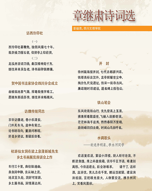侯教授认为,章先生的诗文,贵真尚短,貌似平淡无味,实则味甘隽永,即便是应景之作,一字一句皆自肺腑中流出,这种文字有永久的价值。 他以先生的《三游仙女洞在达州日报新春座谈会上作》《留别大竹师范学校》《水调歌头——欢送李明泉,季水河同学》《检查教育实习城北道中》和《哭秋子》等诗词为例,指出先生的诗词具有“有讲究、有生活、有情感、有智慧”的艺术特点。