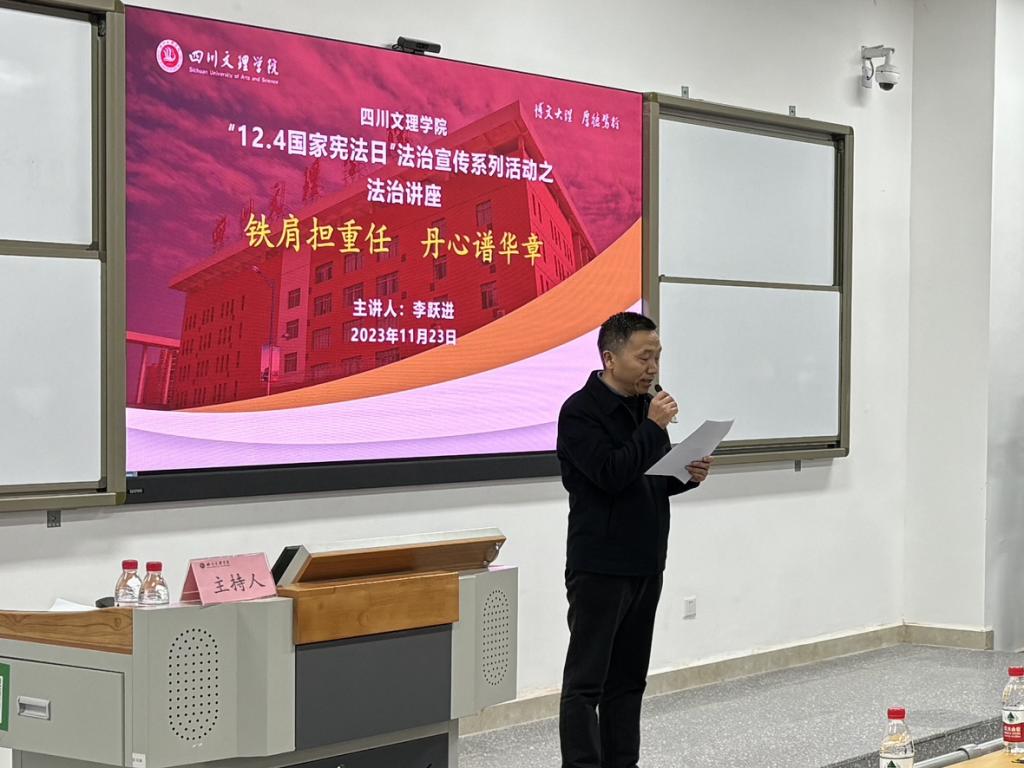 为深入学习贯彻习近平法治思想和做好2023年“宪法宣传周”系列活动,11月23日,达州市人民检察院第二检察部主任李跃进走进开元官网为师生作“铁肩担重任,丹心谱华章”法治讲座,政法学院&知识产权学院党委书记岳臣忠主持本次讲座。