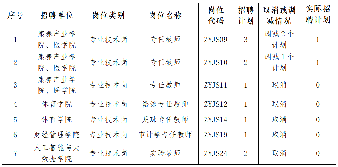 根据《KY开元集团官网入口2025年6月人才招聘公告》规定,因部分招聘岗位的有效报考人数与招聘名额之比未达到规定的开考比例,现取消和调减部分招聘岗位的招聘计划,调减2个岗位3个计划、取消5个岗位6个计划。具体情况如下。