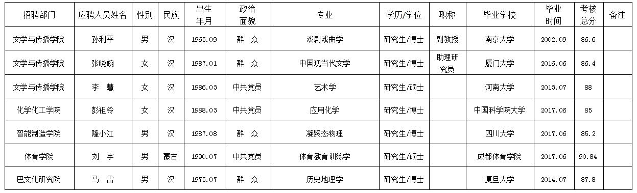 按照《KY开元集团官网入口2017年考核招聘高层次人才、艺术类和体育类专任教师公告》,由学校纪委监督,考核小组对应聘开元官网专任教师、科研人员进行了考核。经学校研究,现将考核结果公示如下,公示期限为7个工作日(2017年6月8日至2017年6月16日)。公示期间接受社会监督和举报,举报者应以真实姓名书面或电话向KY开元集团官网入口人事处或纪委反映。监督举报电话:0818-2790077、0818-2790019 邮箱:scwlrsc@126.com、jwjsc@sohu.com。