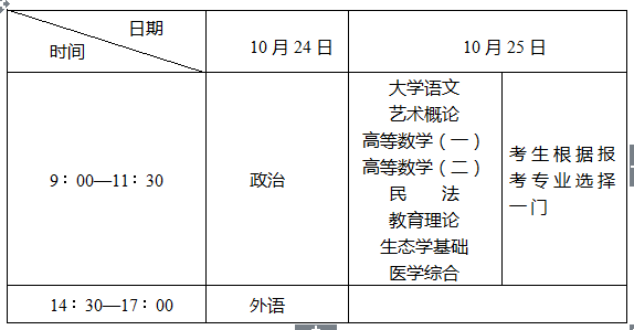 二、考试时间 (一)、高中起点升本、专科考试时间表 (二)、专科起点升本科考试时间表