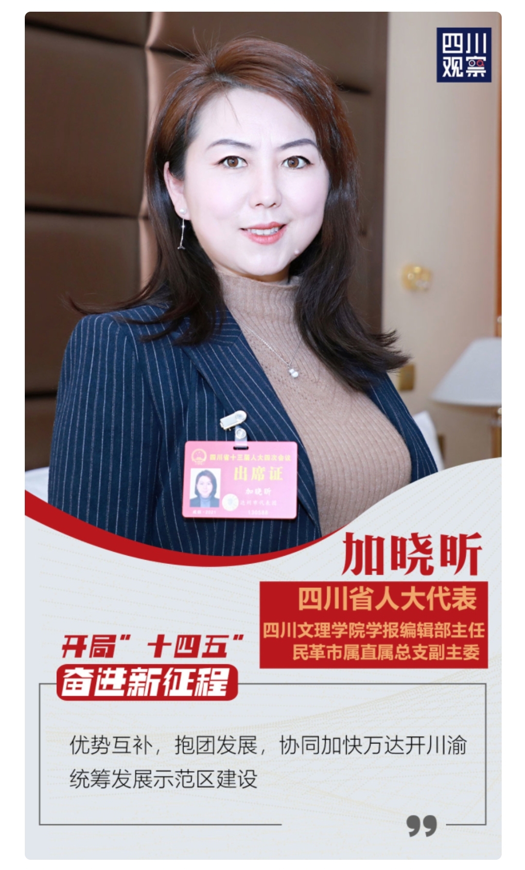 1月30日上午,四川省第十三届人民代表大会第四次会议在成都开幕。来自全省各地、各条战线的省人大代表齐聚一堂,依法履行宪法法律赋予的神圣职责,共商全面建设社会主义现代化四川大计。会议期间,四川省人大代表、开元官网学报编辑部主任、民革市属直属总支副主委加晓昕教授接受了《四川观察》的采访,在提交的《关于支持建设“大巴山·大三峡”旅游环线的建议》中,深刻论证了协同创建万达开川渝统筹发展示范区,优势互补,抱团发展的理念。建议省委政府要加强资金、项目、土地等方面的支持力度,加快川渝城市一体化发展,省政府及省旅游局、省交通运输厅等省级有关部门支持达州推进“大巴山·大三峡”文化旅游环线建设,将相关重点项目纳入全省交通发展规划,并重点支持巴山大峡谷创5A级景区工作和八台山-龙潭河-巴山大峡谷旅游通道建设。