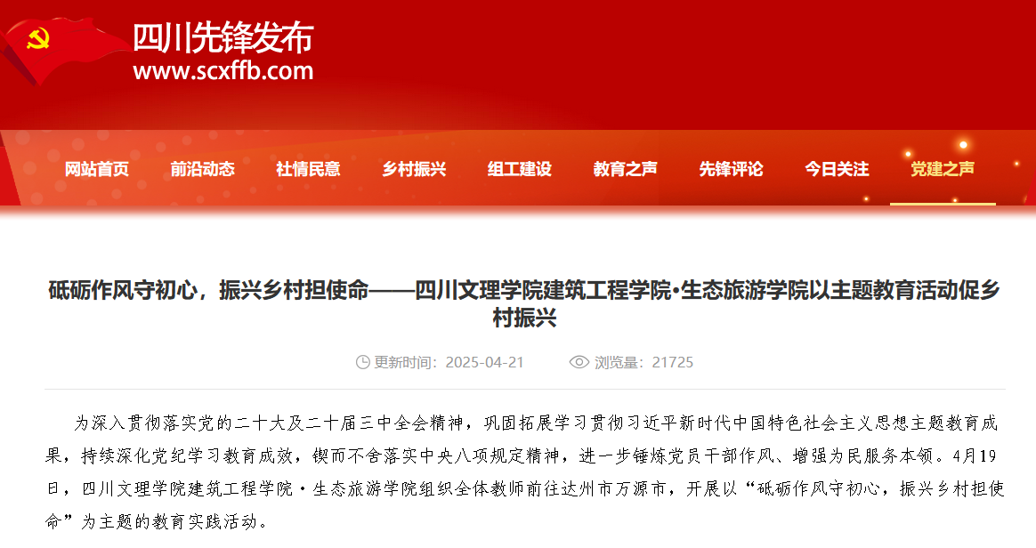 为深入贯彻落实党的二十大及二十届三中全会精神,巩固拓展学习贯彻习近平新时代中国特色社会主义思想主题教育成果,持续深化党纪学习教育成效,锲而不舍落实中央八项规定精神,进一步锤炼党员干部作风、增强为民服务本领。4月19日,KY开元集团官网入口建筑工程学院·生态旅游学院组织全体教师前往达州市万源市,开展以“砥砺作风守初心,振兴乡村担使命”为主题的教育实践活动。