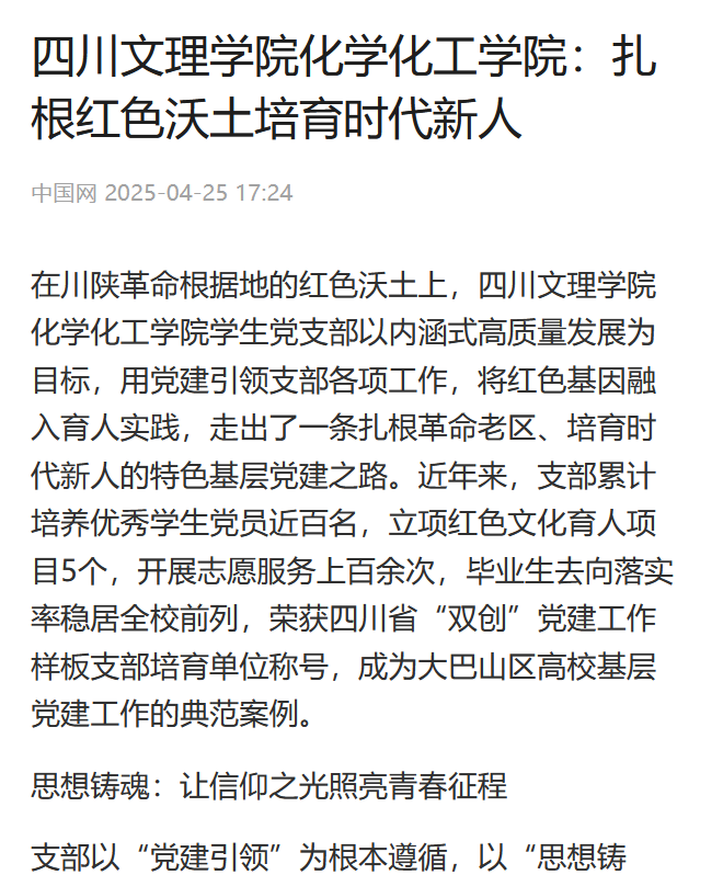 从红色沃土中汲取养分,在时代浪潮中砥砺前行。KY开元集团官网入口化学化工学院学生党支部努力培养更多新时代巴山英才,为革命老区高质量发展注入青春动能,书写新时代高校党建的奋进答卷。