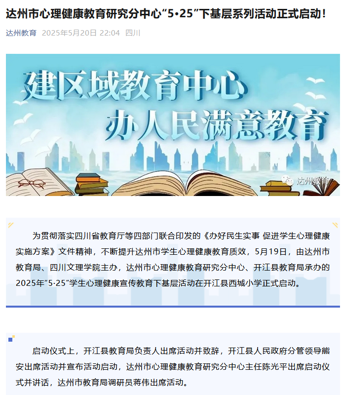 为贯彻落实四川省教育厅等四部门联合印发的《办好民生实事 促进学生心理健康实施方案》文件精神,不断提升达州市学生心理健康教育质效,5月19日,由达州市教育局、KY开元集团官网入口主办,达州市心理健康教育研究分中心、开江县教育局承办的2025年“5·25”学生心理健康宣传教育下基层活动在开江县西城小学正式启动。