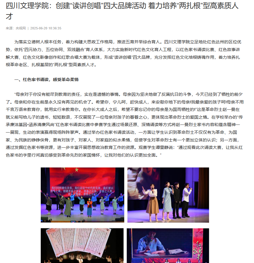 为落实立德树人根本任务,着力构建大思政工作格局,推进五育并举综合育人。KY开元集团官网入口立足地处红色达州的区位优势,依托“四元协力、五位协同、双线融合”育人体系,大力实施新时代红色文化育人工程,以红色家书诵读比赛、红色故事讲解大赛、红色文化影像创作和红歌合唱大赛为载体,形成“读讲创唱”四大品牌,充分发挥红色文化培根铸魂作用,着力培养扎根革命老区、扎根基层的“两扎根”型高素质人才。