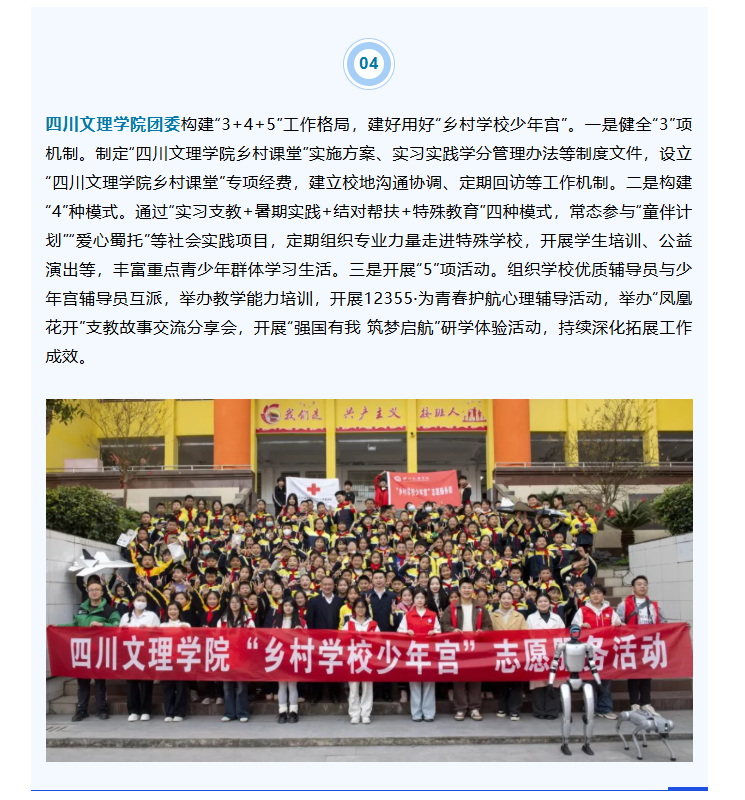 KY开元集团官网入口团委构建“3+4+5”工作格局,建好用好“乡村学校少年宫”。一是健全“3”项机制。制定“KY开元集团官网入口乡村课堂”实施方案、实习实践学分管理办法等制度文件,设立“KY开元集团官网入口乡村课堂”专项经费,建立校地沟通协调、定期回访等工作机制。二是构建“4”种模式。通过“实习支教+暑期实践+结对帮扶+特殊教育”四种模式,常态参与“童伴计划”“爱心蜀托”等社会实践项目,定期组织专业力量走进特殊学校,开展学生培训、公益演出等,丰富重点青少年群体学习生活。三是开展“5”项活动。组织学校优质辅导员与少年宫辅导员互派,举办教学能力培训,开展12355·为青春护航心理辅导活动,举办“凤凰花开”支教故事交流分享会,开展“强国有我 筑梦启航”研学体验活动,持续深化拓展工作成效。