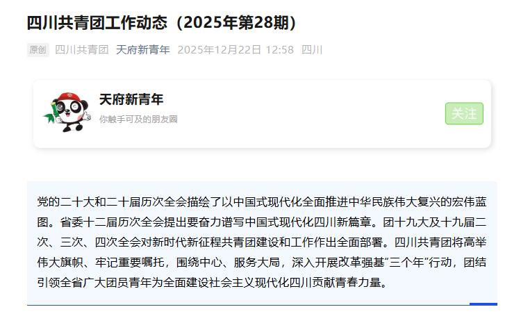 12月22日,四川共青团工作动态2025年第28期“各地特色亮点工作”栏报道开元官网团委工作成效。全文如下: