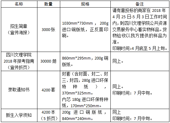 1.请三家潜在供应商于2018年4月25日至5月3日工作时间到行政楼4018办公室查看印制实物样品。
