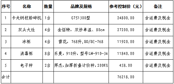 KY开元集团官网入口后勤处树枝粉碎机、双头大灶等物资采购项目;预算价76218.00元(大写:柒万陆仟贰佰壹拾捌元整),超过预算的报价为无效报价。