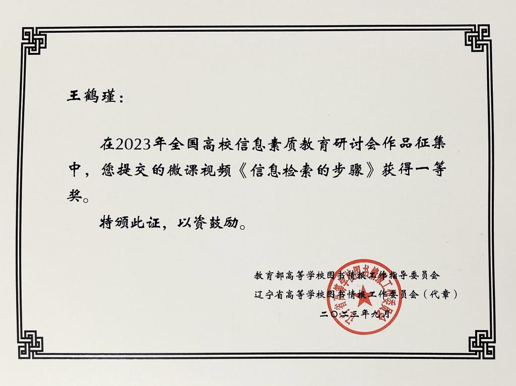 9月21日至23日,2023年全国高校信息素质教育研讨会在沈阳召开,开元官网图书馆青年教师郭碧玉、王鹤瑾参加研讨会,王鹤瑾老师获微课视频一等奖。