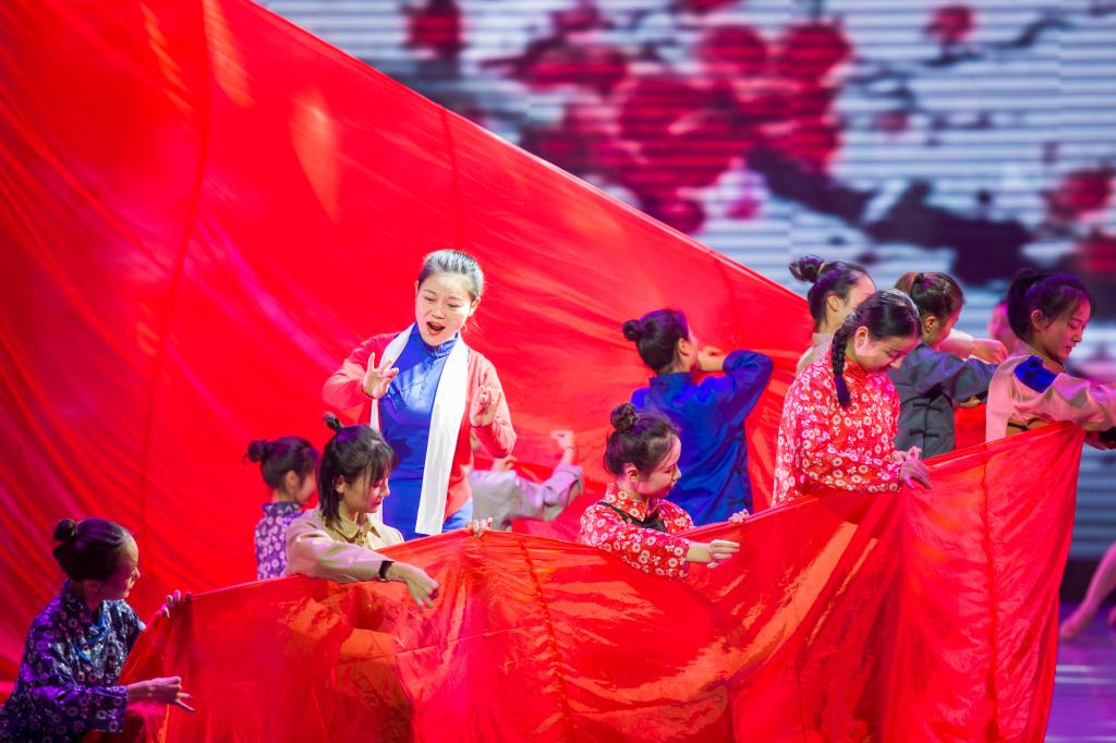 何老师说:“我在《忆红旗》中通过当代大学生和江姐这一人物的穿越时空的对唱,以缅怀历史、致敬先烈为主线,采用重唱、合唱等表现手法,融音乐、舞蹈、戏剧等表演形式于一体,展现青年大学生对革命精神的传承和强烈的爱国主义精神。”