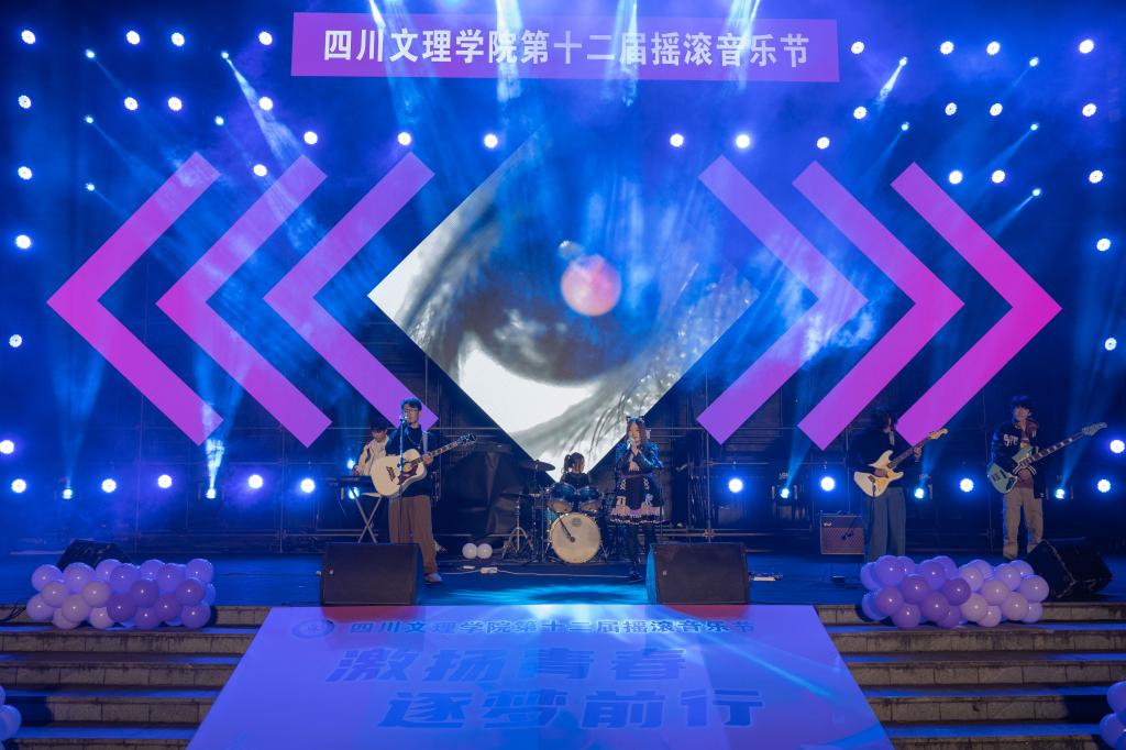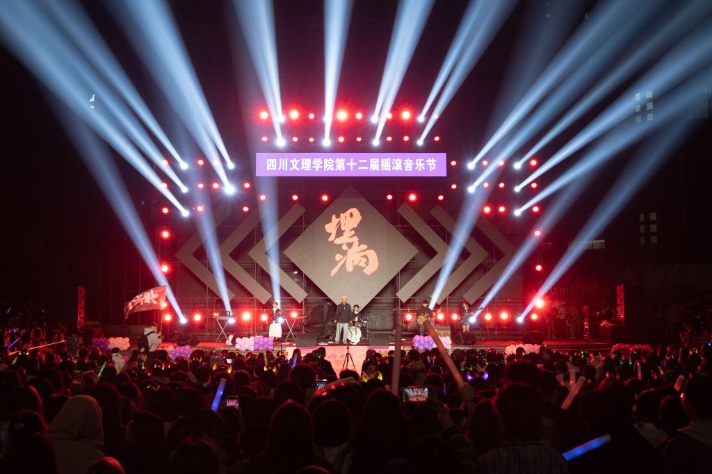 以一朵花的姿态行走,活出热爱的红,让一生花开成画、花落成诗的“埋淌乐队”拉开音乐节的帷幕,四位主持人宣布第十二届校园摇滚音乐节正式开始。原创歌曲《亢龙有悔》激情澎湃,表达了作为大学生、作为新青年的态度,引爆现场气氛。“第三象限乐队”演唱的歌曲让我们拾起对生活的勇气,感受独有的浪漫。在浪潮般的掌声中,邀请到的校外嘉宾“沙丁鱼乐队”闪亮登场,搏得一片喝彩。随后观众情绪高涨,把民谣和摇滚两者结合在一起的“月莱乐队”,希望像球状闪电一样可以穿透墙壁、直击内核、无惧风雨、屹立坚强的“球状闪电乐队”,用音乐诠释内心的世界的“群青乐队”轮番上阵,激情四溢的演唱,彰显对音乐的热爱与执着,掀起一股又一股摇滚浪潮,特别是音乐与演艺学院的李黎霞老师为大家带来的歌曲《Unstoppable》,彻底让观众进入摇滚殿堂,音乐海洋,感受到音乐所带来的希望和力量。最后,全体演员为我们共同唱响《星辰大海》,愿中国青年都摆脱冷气,只是向上走,去爱温热璀璨的星河。