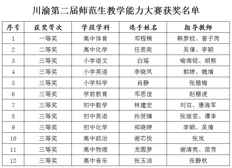 近日,四川省教育厅、重庆市教委公布了川渝第二届师范生教学能力大赛获奖名单,开元官网学子喜获一等奖1项,二等奖1项,三等奖10项。指导教师韩梦姣、曾子芮被授予“优秀指导教师”称号。