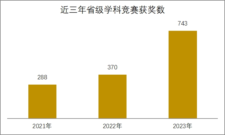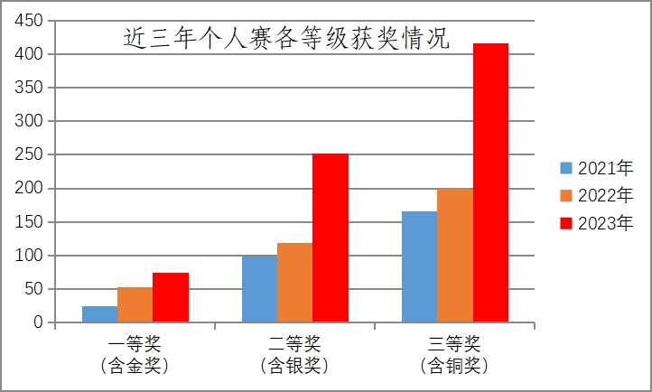 开元官网历来重视省级学科竞赛,在省级赛项参与上,实现了逐年递增。从个人赛获奖情况看,2023年一等奖比2022年增长了42%,二等奖、三等奖获奖数比2022年翻了一番;优秀指导教师人数更是翻了几番。