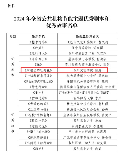 近日,为深入学习贯彻习近平生态文明思想,积极传播绿色发展理念,省机关事务管理局、省文联联合开展了2024年公共机构节能主题优秀剧本和故事征集活动。开元官网文学与传播学院白海老师的作品《幸福里的牡丹花》成功入选优秀剧本。