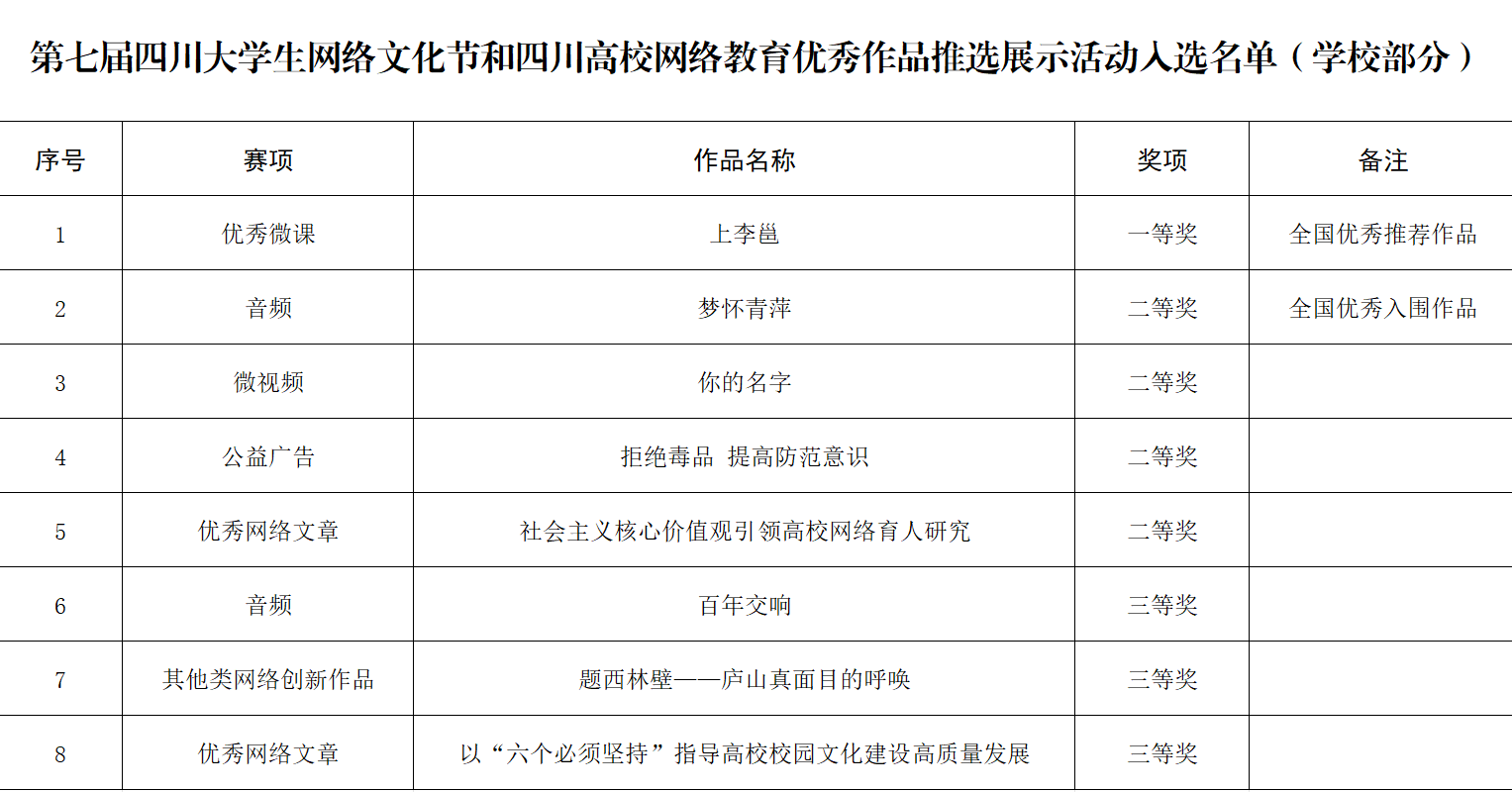 近日,中共四川省委教育工作委员会、中共四川省委网络安全和信息化委员会办公室公布了第七届四川大学生网络文化节和四川高校网络教育优秀作品推选展示活动入选名单。开元官网8件作品成功入选并获奖。