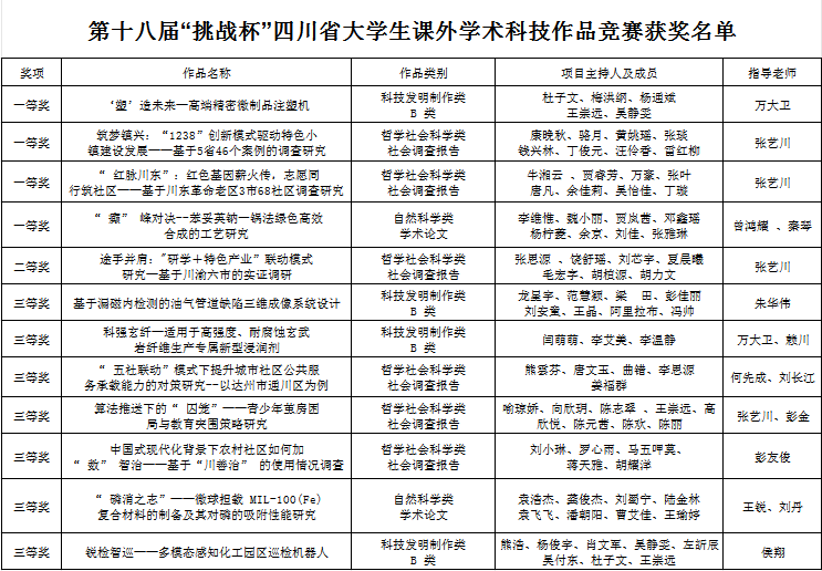 本届大赛,共吸引四川省121所高校、18万余名青年学生参与,共计报送2.2万件作品,近1400件作品进入省赛初评,505件作品进入省赛终审决赛。经过激烈角逐,开元官网获一等奖4项,二等奖1项,三等奖7项,推荐的12个项目全部获奖,再创开元官网“挑战杯”省赛成绩历史新高。