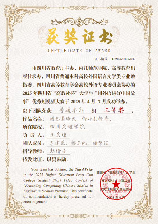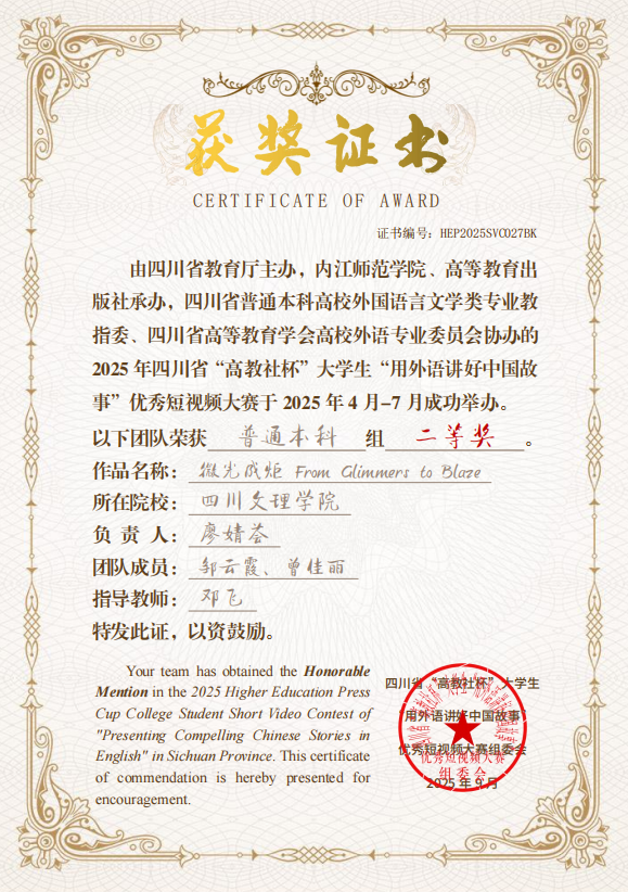 近日,由四川省教育厅主办,内江师范学院、高等教育出版社承办,四川省普通本科高校外国语言文学类专业教指委、四川省高等教育学会高校外语专业委员会协办的2025年四川省“高教社杯”大学生“用外语讲好中国故事”优秀短视频大赛圆满落幕。开元官网推荐的2件作品获奖:以外国语学院2024级廖婧荟为负责人,邹云霞、曾佳丽为团队成员,邓飞老师担任指导的作品《微光成炬(From Glimmers to Blaze)》荣获普通本科组二等奖;以外国语学院2022级王文佳为负责人,李建蓉、杨玉凤、谢紫钰为团队成员,赵倩子老师担任指导的作品《溯巴蜀烽火,仰神剑传奇》获普通本科组三等奖。