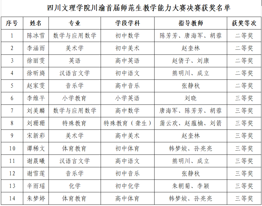近日,川渝首届师范生教学能力大赛成功落下帷幕,开元官网14名选手进入决赛,其中陈冰雪、李涵雨、徐丽雯、徐昕旖、赵家雯等5位学生获得二等奖,李维平、刘美麟、刘珊珊、宋新彩、谭稀文、谢晨曦、谢雪莲、辛雨瑶、朱梦婷等9位学生获得三等奖。获奖学生分别来自数学与应用数学、英语、汉语言文学、化学、小学教育、特殊教育、音乐学、美术学、体育教育等9个专业。