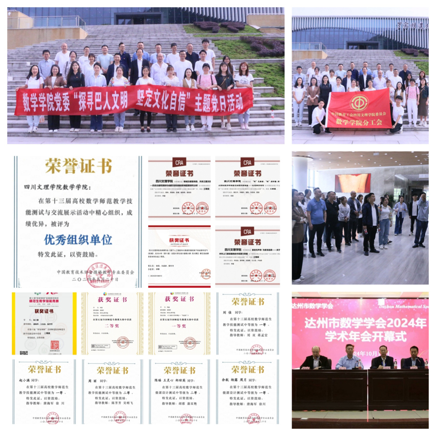 数学学院党委认真学习贯彻习近平新时代中国特色社会主义思想、党的二十大和全国教育大会精神,充分发挥基层党组织战斗堡垒作用。2024年,学院党委组织师生党员参观罗家坝遗址博物馆,开展“探寻巴人文明,坚定文化自信”主题党日活动;组织2021级学生党员参与“青年党员说”研学活动,追寻革命先辈足迹。数学教研室党支部被学校党委推荐申报“双带头人”教师党支部书记“强国行”专项行动计划;打造“三服务”党建服务品牌,与达州市中小学合作,开展教育活动,协助达州市数学学会举办2024年学术年会。学院坚持“党建引领、赛教贯通、教改提质”育人机制,在2024年全国大学生数学建模竞赛、第十四届全国大学生市场调查分析大赛、第十三届全国高校数学师范生教学技能测试大赛等国家级比赛中斩获多项大奖。